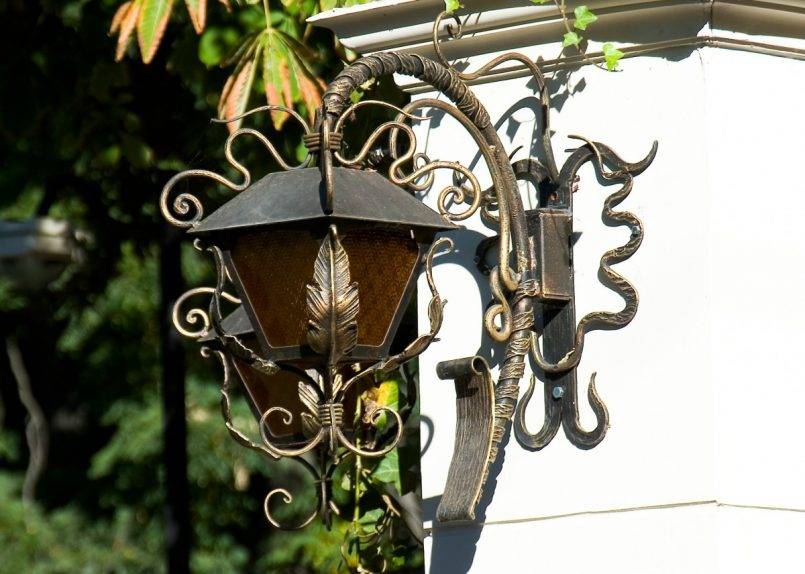 Лучше всего выбирать фонари на стойках и подвесах из чугуна, алюминия, стали и других цветных металлов. Кронштейн для уличного светильника так же должен быть изготовлен из крепкого материала. Кованые фонари считаются в этом случае самыми долговечными, поэтому их рекомендуют к установке большинство ландшафтных дизайнеров современности.