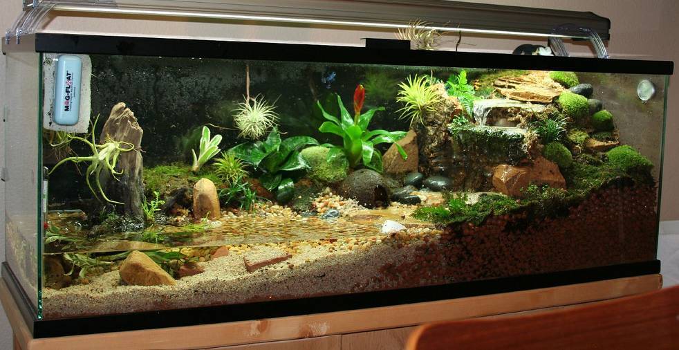 В домашних условиях красноухая черепаха круглый год обитает в аквариуме или акватеррариуме.