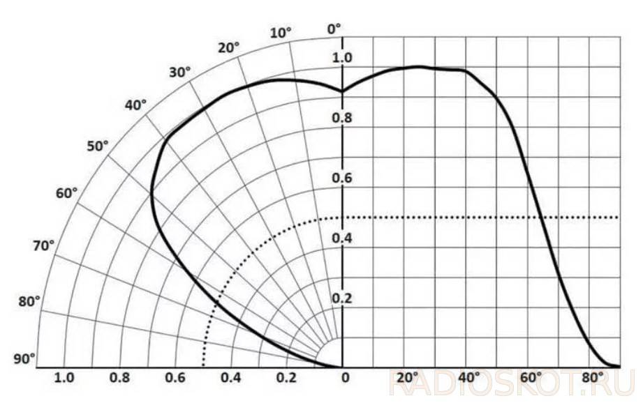 Описанные выше светодиоды Luminus Devices, Vishay и SETi / Seoul Viosys UV-C имеют угол луча 130°, 120° и 125° соответственно. На рисунке показана диаграмма направленности XBT-3535-UV-A130-CC275-01. Пунктирная линия показывает где было достигнуто 50% пикового значения, что определяет угол луча +/-65°.