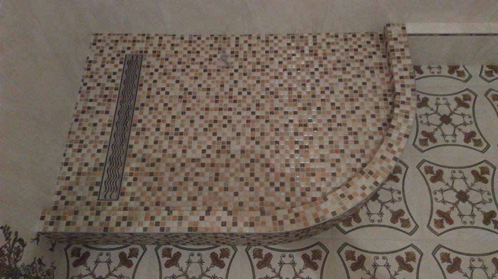 Как выложить душевой поддон этими материалами? Точно также, как любую другую поверхность. Надо только помнить, что при выкладке кафеля и мозаики следует сделать уклон в сторону сливного отверстия. Возможно, варьируя толщину слоя клея или цементной подложки. Швы между кафельными плитками или мозаичными модулями замазываются водоотталкивающим составом.