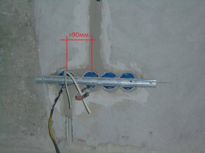 вдруг выключатель окажется шире? Поэтому лучше делать минимальное расстояние между осями установочных коробок 90 мм. или более.