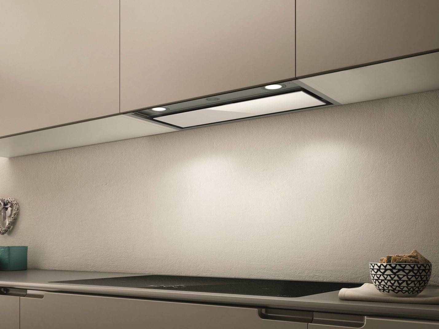 Их можно полностью скрыть в кухонной мебели. Для этого вытяжка устанавливается внутрь корпуса подвесного кухонного шкафа. Обычно такое оборудование используют в маленьких кухнях, где нужно сэкономить пространство и убрать “визуальный шум”.