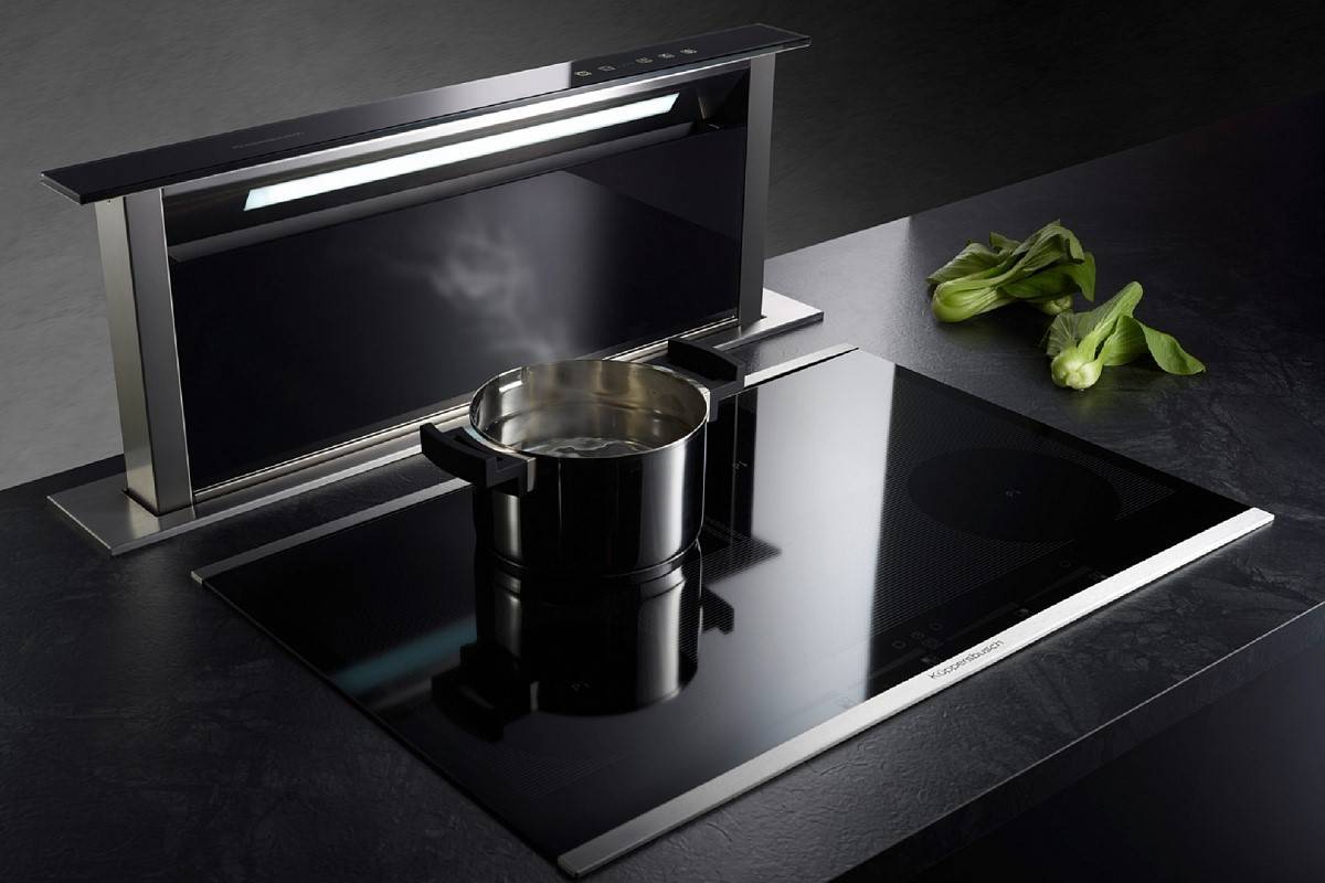 Нестандартная вытяжка, которая устанавливается в столешницу, а не над ней. Во время приготовления пищи выдвигается из стола. Такие устройства намного дороже стандартных, но позволяют сэкономить место и почти незаметны.