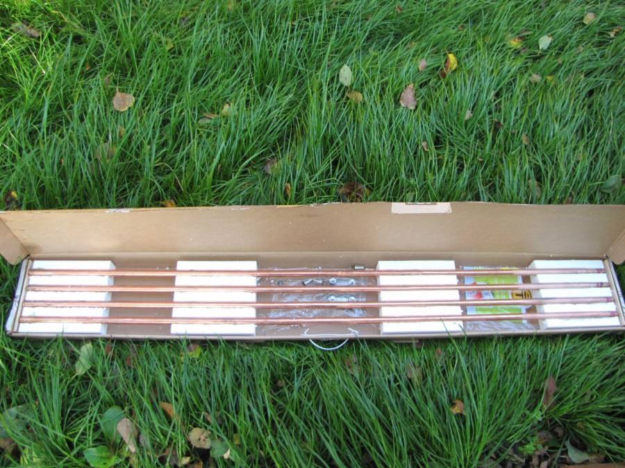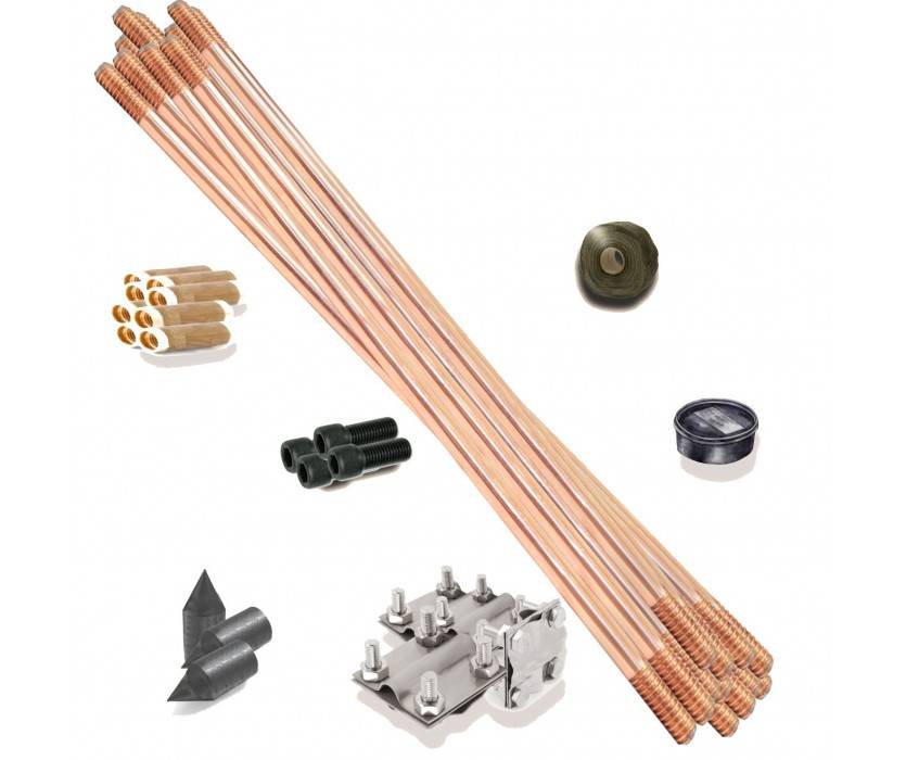 В комплект входят г-образный электрод из нержавеющей трубы, перфорированной, длинной три метра, заполненный специальным наполнителем, четыре мешка глинисто – графитного порошка, хомут с многожильным медным проводом, для подключения ко внутреннему контуру дома