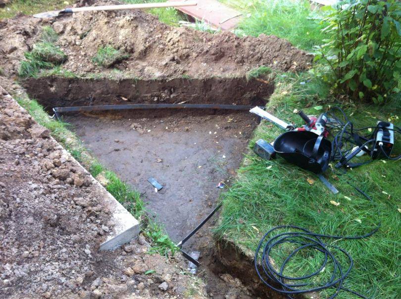 После того как было выбрано место, выполнена разметка (под треугольник со сторонами 3 м), определено место вывода полосы с болтами на фундамент здания можно приступать к земляным работам.
