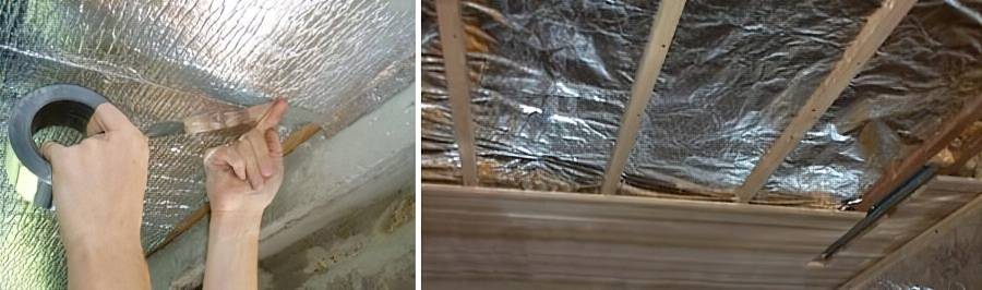 Материал при возведении дома из бруса или каркасного закрепляется по балкам. После чего выполняется подшивка. В качестве защиты от влаги и пара можно использовать обычную полиэтиленовую пленку. В качестве второго варианта гидроизоляции применяют влагозащитные мембраны. Если уложить все слои правильно, конструкция будет надежно и грамотно сточки зрения теплотехники защищена от холода.