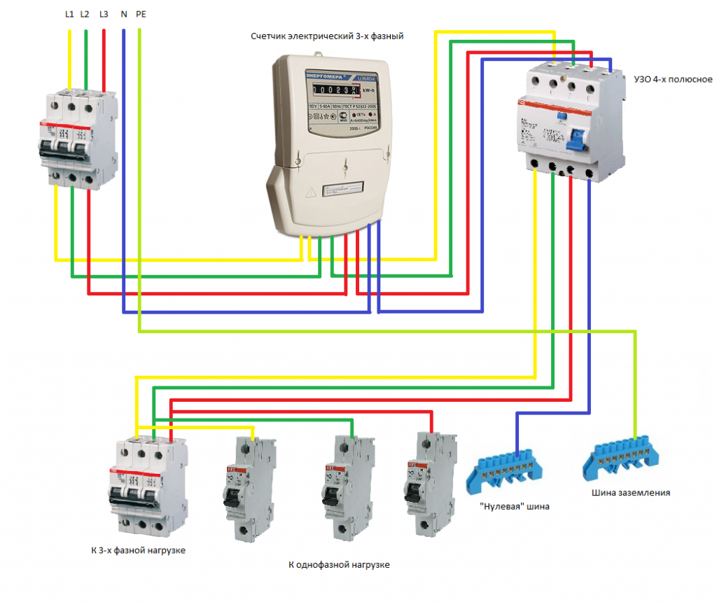 Схема подключения УЗО в однофазной сети представлена ниже.
