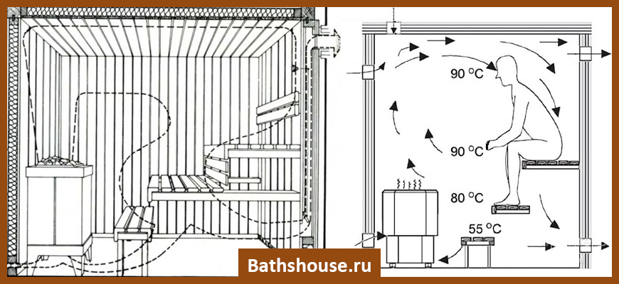 Но в ней необходимо поддерживать комфортную для приема процедур температуру, причем так, чтобы не образовывались сквозняки, и не было резкого перепада от жары на полке до холода на полу. Для этого воздушные потоки должны двигаться по определенной траектории, которую задают посредством размещения приточных и вытяжных отверстий в конкретных местах.