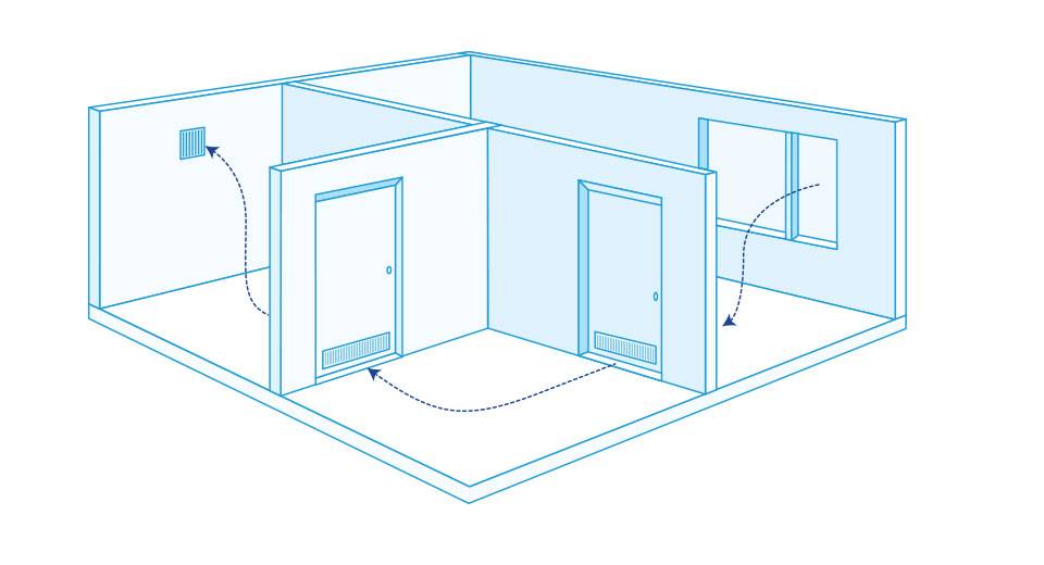 Если же точка притока находится близко к переточной решетке (на смежной стене), то переточку обязательно нужно монтировать внизу дверного полотна. Это делается, чтобы свежий воздух не удалялся сразу из комнаты (а это и произойдет, если переточка и приточка расположены слишком близко).