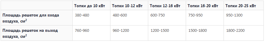 Решетки, которые можно использовать для притока и выхода воздуха в зависимости от мощности топки: