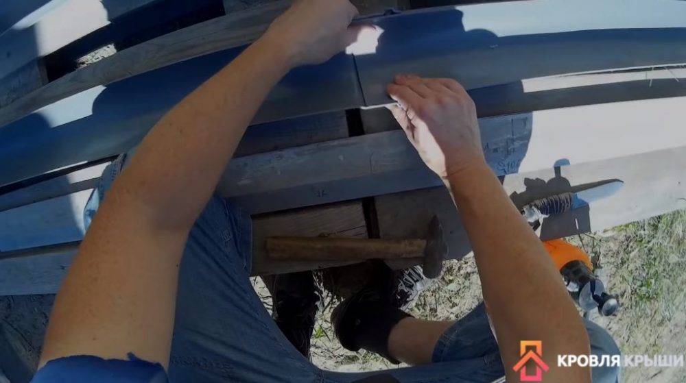 Можно воспользоваться другим способом при соединении желобов их углов между собой. Для этого отогните вверх заднюю кромку желоба, потом нанесите вдоль стыка герметик. Вставьте желоба друг в друга с нахлестом 50-100 мм. Отогните заднюю кромку обратно вниз для надежной фиксации. Желоб вставьте в крюки так, чтобы торцы желоба выступали от торца крыши не менее, чем на 20 мм. На торцы желоба установите заглушки.