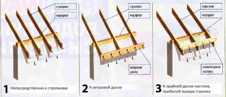 Если установка крюков происходит не на лобовой доске, а на стропилине или на последнем бруске обрешетки, то делают пазы, чтобы сравнять поверхности крюков с поверхностью стропила или обрешетки.