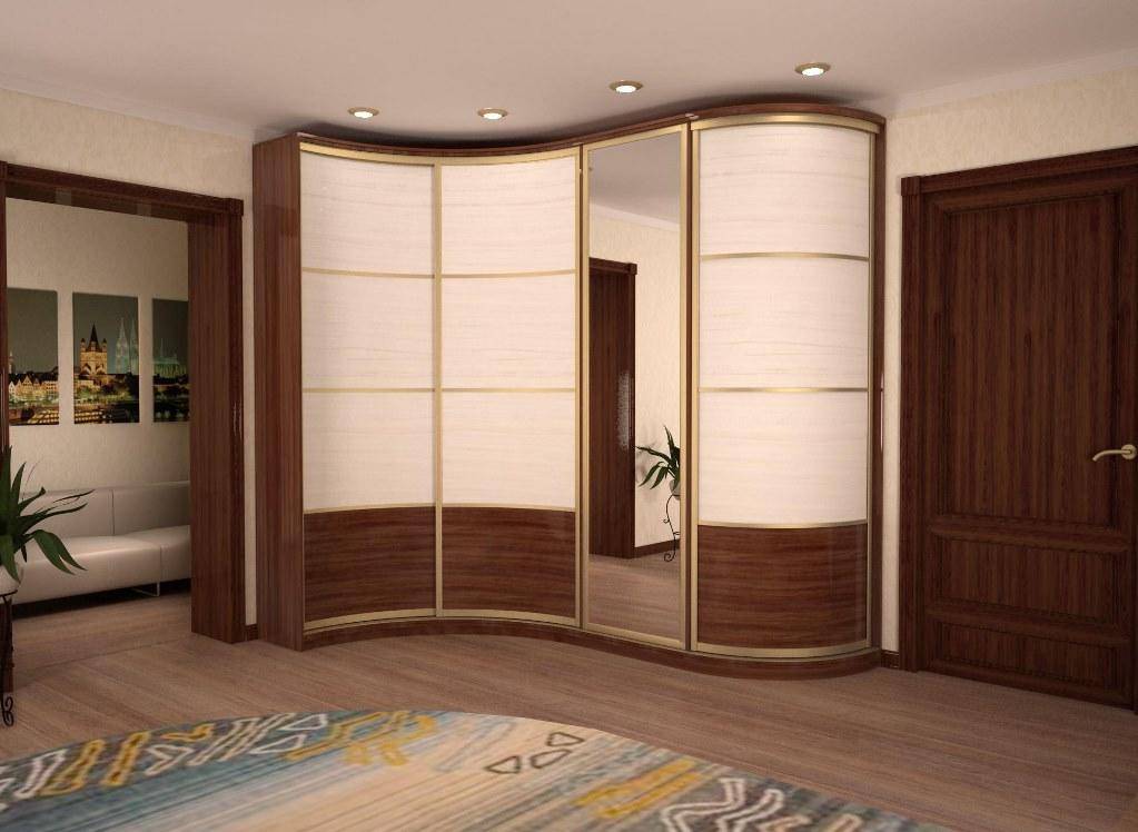 Еще один вариант шкафа-купе для небольшого коридора — угловая модель. Комплектуются такие шифоньеры радиусными створками, которые смотрятся необычно. Для экономии места можно купить тонкую модель г-образной формы.