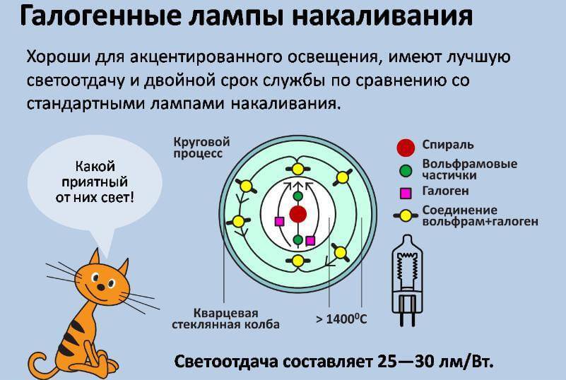 Устройство осветительных элементов с нитью накаливания сходно: стеклянная колба, тело накала, цоколь. Но только галогенные лампы содержат йод или бром. Благодаря химическим процессам во время работы газообразное наполнение в таком составе позволяет значительно продлить срок службы источника света: высвобожденные с тела накала атомы вольфрама взаимодействуют с галогенами (йод, бром), что создает препятствие их дальнейшему осаждению на внутренних стенках колбы.