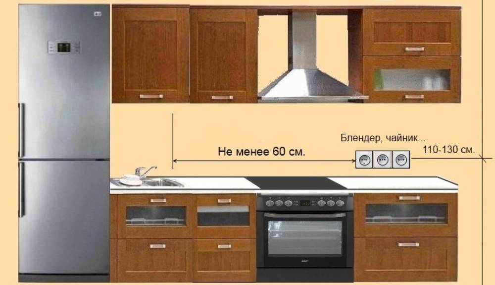 На кухне электротехнические изделия должны располагаться на расстоянии 60 см от газопроводов и источников воды. Учитывая стандарты высоты мебели, электророзетки можно ставить на трех уровнях: