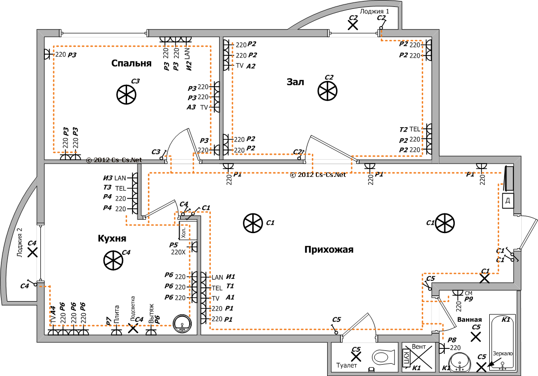 Для каждого помещения до проведения электротехнических работ необходимо составить эскиз, план-схему в масштабе с расположением мебели и электроприборов, отметить на ней места подключения к электрической сети, включая слаботочные цепи: телефон, телевидение, сигнализацию и другие устройства.