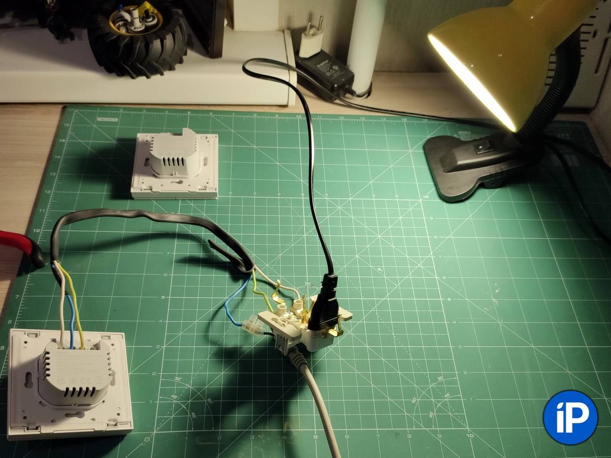 - Соединяем выключатель с приемником и подключаем электроэнергию.