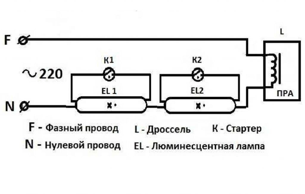 Внимание! Температура в трубке не должна быть свыше 55 градусов. Поэтому данную лампу нельзя применять в промышленных горячих цехах. Классическая электросхема