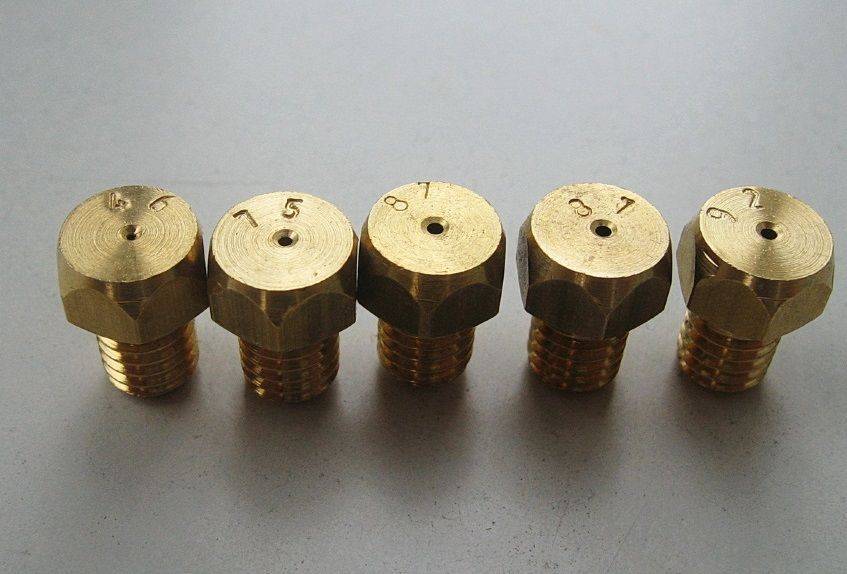 Жиклер (форсунку или сопло) изготавливают обычно из бронзы или латуни. Он выглядит как болт с резьбой, но только с внутренним отверстием, через которое подается топливо. Чем оно больше, тем больше газа через него поступает. На торце форсунки выбивают цифры, которые обозначают диаметр отверстия в сотых долях миллиметра. Например, число 75 означает, что диаметр отверстия составляет 0,75 мм, а число 115 соответствует диаметру 1,15 мм.