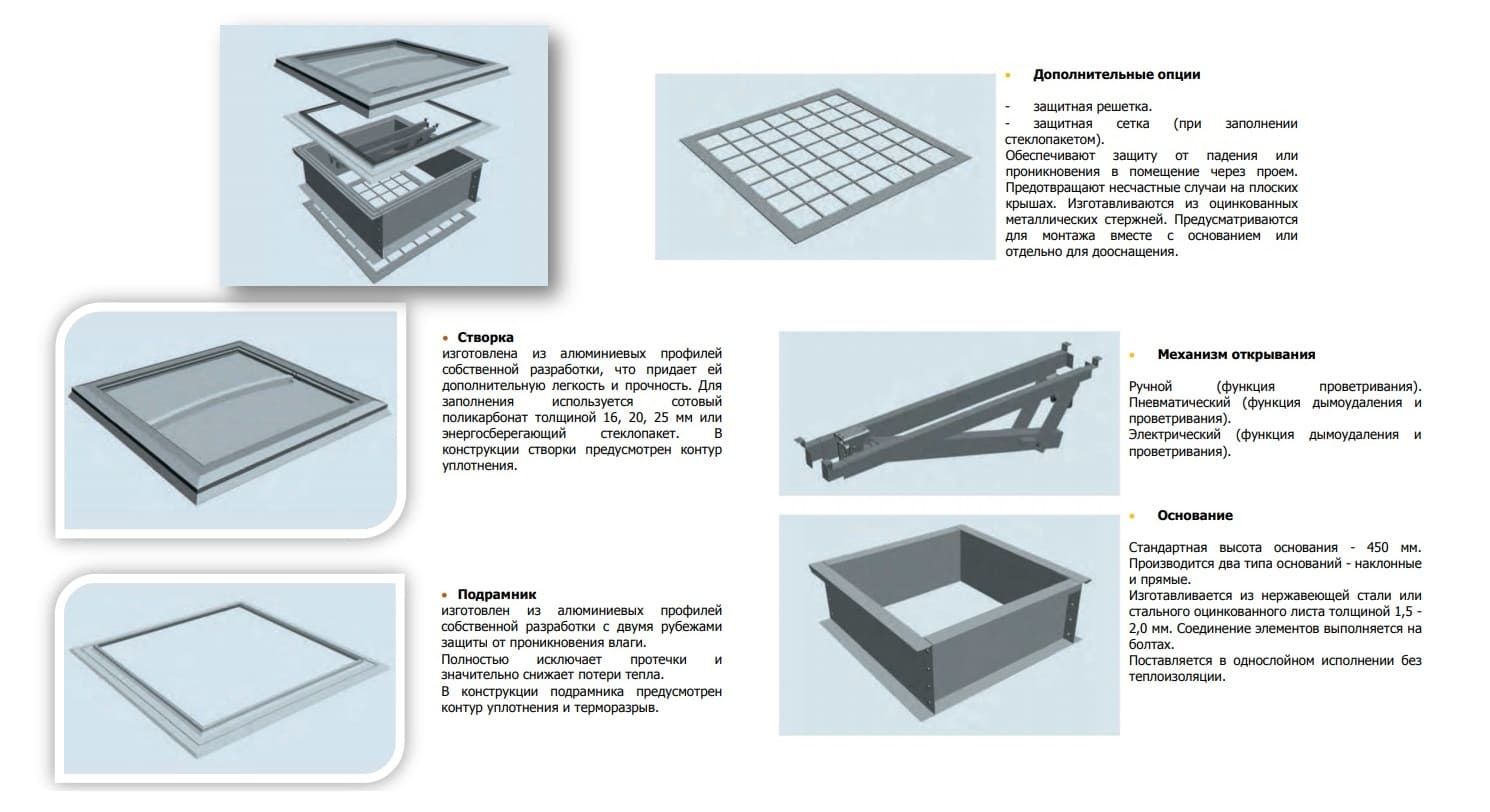 В конструктивный состав зенитных фонарей удаления дыма, комплектно поставляемых на объекты строительства компаниями изготовителями, входят следующие элементы: